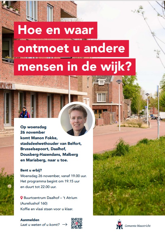 Op woensdag 26 november komt Manon Fokke, stadsdeelwethouder van Belfort, Brusselsepoort, Daalhof, Dousberg-Hazendans, Malberg en Mariaberg, naar u...